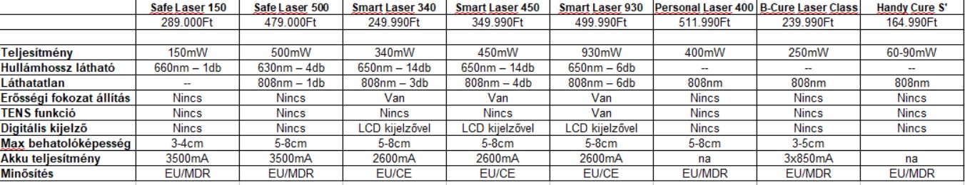 A választás megkönnyítésének érdekében összeállítottunk egy táblázatot a lágylézer termékek technikai adatai alapján:
